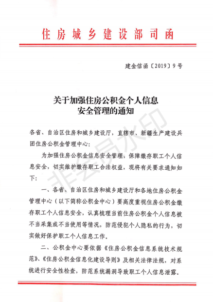 现将住建部公积金监管司《关于加强住房公积金个人信息安全管理的通知》(建金信函[2019]9号)转发你们,请认真研究落实,加强住房公积金信息安全管理,保障缴存职工个人信息安全,切实维护缴存职工的合法权益。